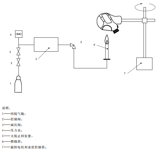 測試原理:將被測試樣佩戴在金屬頭模上,調(diào)整金屬頭模高度,使燃燒器頂端與面罩最下端垂直距離為20mm,然后使金屬頭模位于燃燒器燃燒范圍外。點燃燃燒器后,調(diào)節(jié)燃燒器火焰,使燃燒器火焰高度達到40mm,使距離燃燒器頂端20mm處的火焰溫度達到800℃。啟動金屬頭模運動控制裝置,使被測試樣經(jīng)過燃燒區(qū),記錄通過火焰上方時面罩材料的燃燒情況。