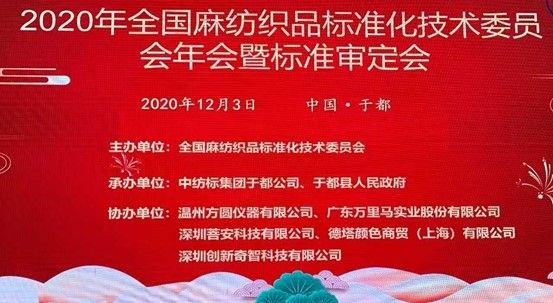 2020年12月3日, 全國(guó)麻紡織品標(biāo)準(zhǔn)化技術(shù)委員會(huì)第四屆第四次委員代表大會(huì)在江西·于都順利召開(kāi)。本屆大會(huì)由全國(guó)麻紡織品標(biāo)準(zhǔn)化技術(shù)委員會(huì)主辦,中紡標(biāo)集團(tuán)于都公司、于都縣人民政府承辦,溫州方圓儀器有限公司、廣東萬(wàn)里馬實(shí)業(yè)股份有限公司、深圳菩安科技有限公司、德塔顏色商貿(mào)(上海)有限公司、深圳創(chuàng)新奇智科技有限公司協(xié)辦。